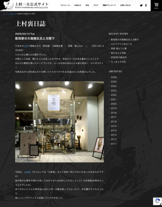 2月から3月末にかけて文喫六本木で開催いたしました個展「彫刻家 大森暁生展 -言葉、樹に沁む-」について、会期中、対談のゲストとしてもご登壇頂きました上村汀さんが、素敵な文章で展覧会後記を書いて下さいました。