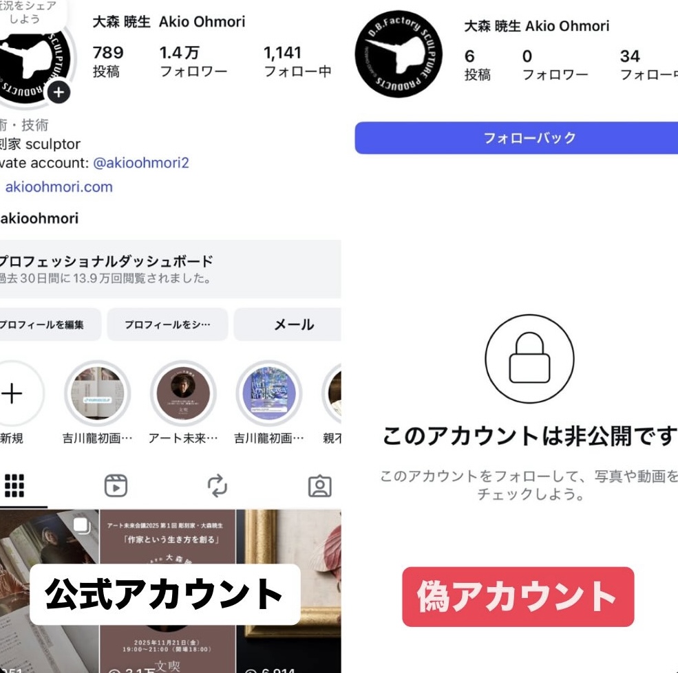 Instagram 偽アカウントにご注意ください November 19, 2025 友人知人よりInstagram 偽アカウントの報告をいただきました。 くれぐれもフォローしないようご注意ください。 ご報告くださいました皆さま、どうもありがとうございます。 彫刻家 大森暁生